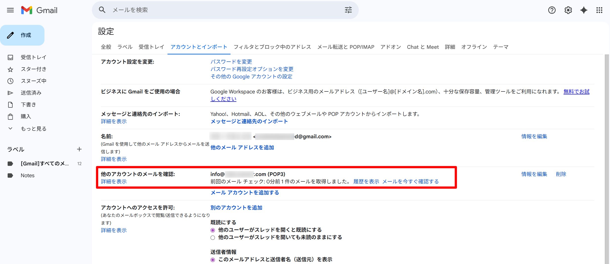 - 「他のアカウントのメールを確認」にメールアドレスが表示されている場合→ POP受信機能をご利用中です